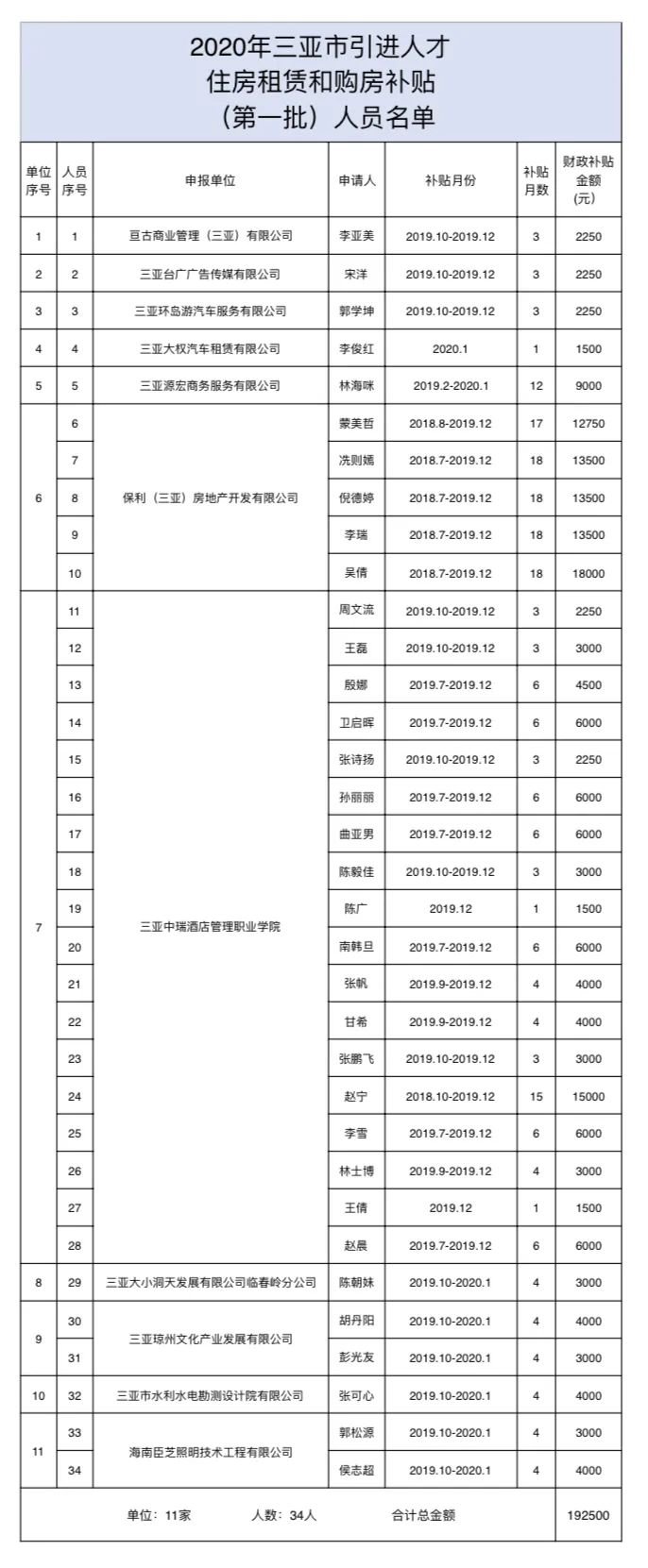 此次公示引进人才名单包含11家单位的34人,合计拟发放补贴192500元。公示期限为2020年3月20日至26日(5个工作日),公示期内群众可对公示人员是否符合引进人才住房租赁补贴申请条件进行监督,通过来电、来信、来访等方式向市人力资源和社会保障局反映情况。