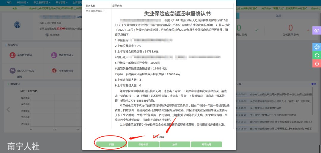 符合申领条件的企业,已开通南宁人社网上办事大厅的,使用CA证书登录南宁市人社局网站人社网上办事大厅,就能收到我们推送的失业保险应急返还确认消息。企业只需核对《失业保险应急返还申报确认书》中内容,提交“确认”即可(见下图),不需再提交纸质材料,实现“免办”。