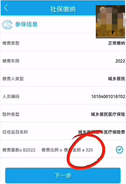 3.选择缴费年限“2022年”、点击“下一步”,核实金额“320元”,点击“下一步”。