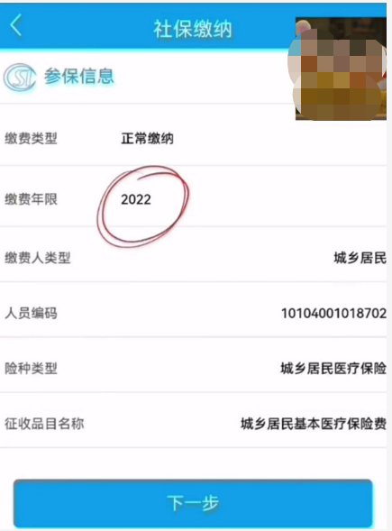 第二步,输入参保人缴费信息,并点击“下一步”,确认缴费信息无误后继续点击“下一步”(缴费年限选2022)