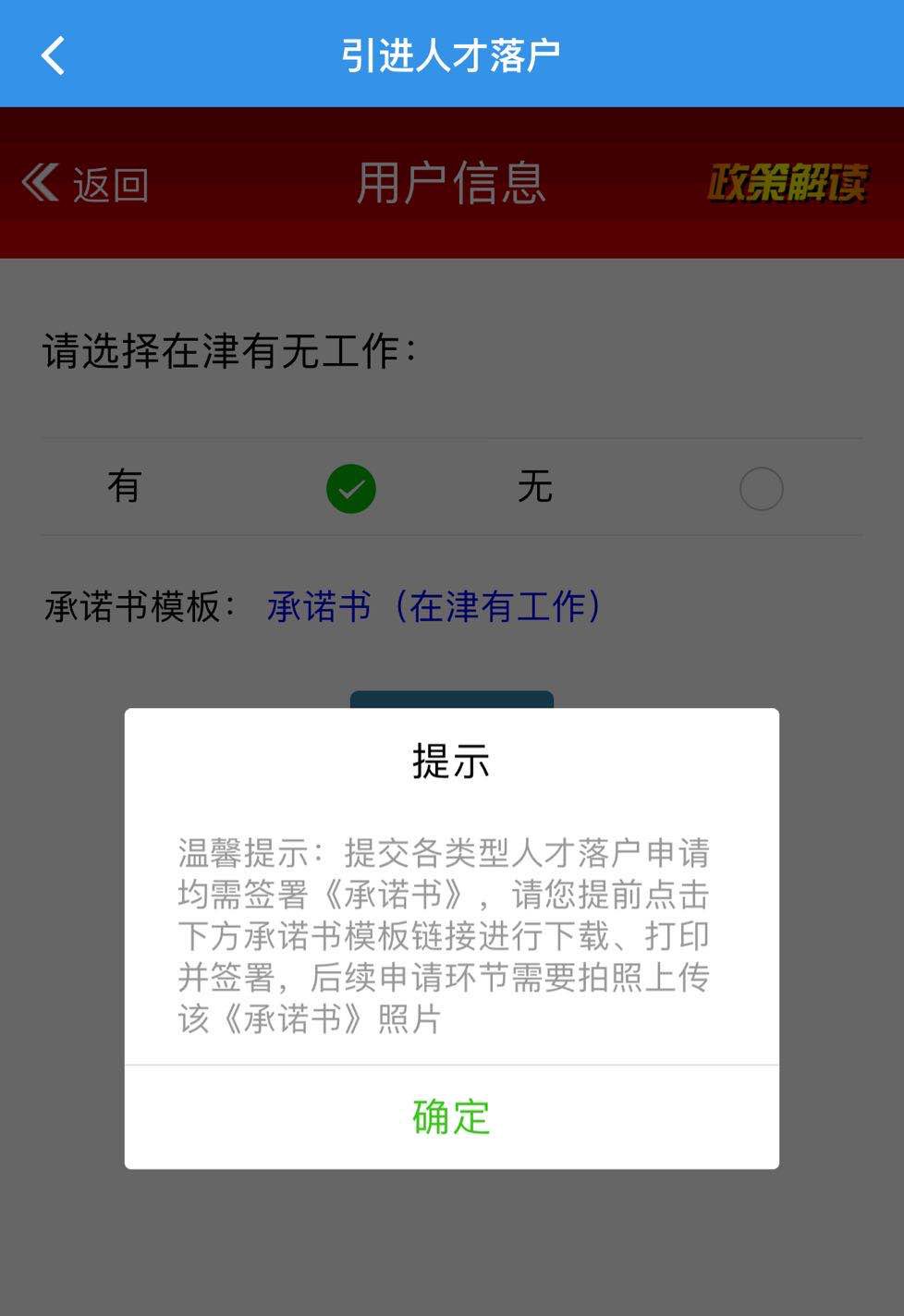 在津有工作落户 注册成功后,在津有工作的按照指示完成承诺书,点击确定