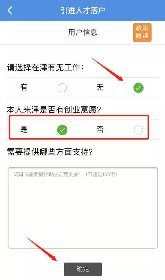 在津无工作落户 注册成功后,在津无工作的选择“无”,并且选择你的来津创业意愿,点击确定即可。