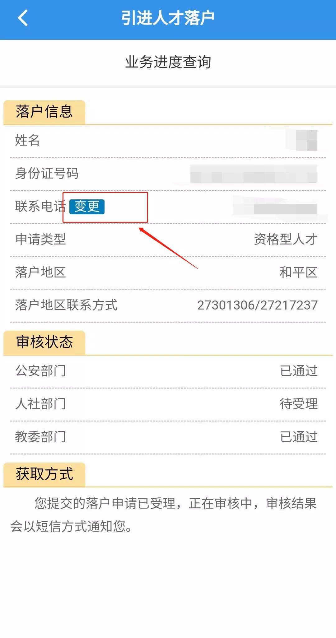 注:如需申请落户的联系电话变更(提交申请系统默认的联系电话为登录系统账号的手机号码),请在提交申请成功后,个人中心的“业务网办进度”中点击“查看”——联系电话右侧的“变更”按钮,输入需变更的手机号码进行变更。