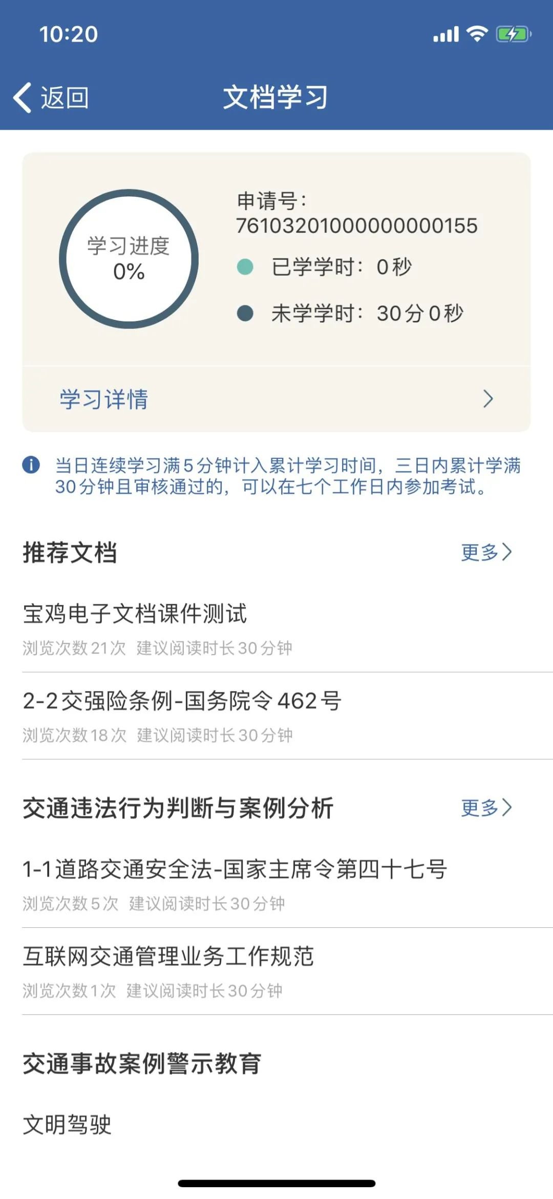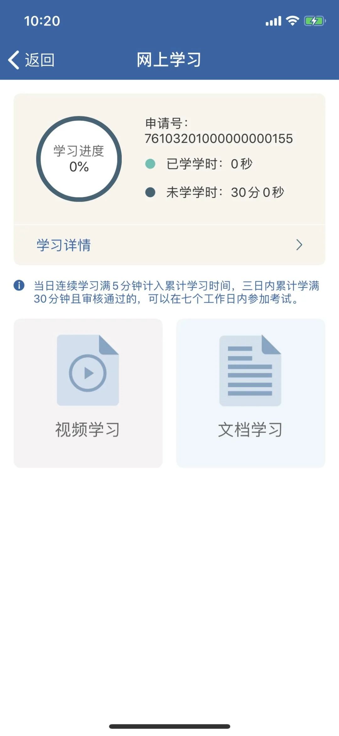 4、点击【视频学习】或【文档学习】进行学习,顶部区域实时更新学习进度,点击【学习详情】,可查看当前所有学习记录;