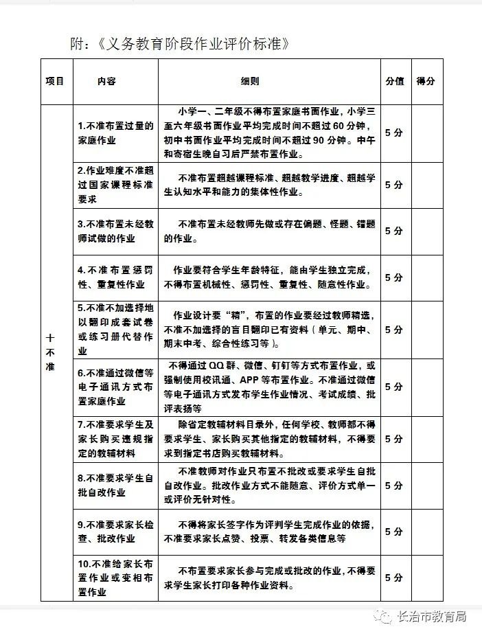 落实《长治市教育局关于进一步加强五大管理提高育人质量的通知》关于作业管理要求,强化管理、严控总量、提高质量,全面减轻学生过重作业负担。