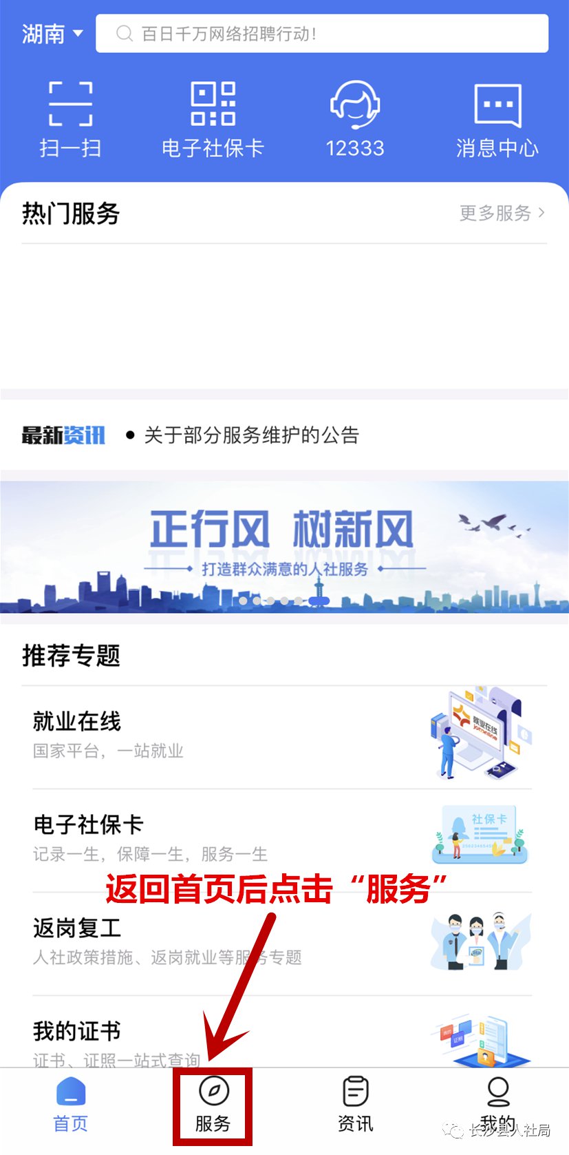 3.返回首页后,点击“服务”即可进入“人社服务”,并点击“社保转移申请”即可进行社保转移申报。