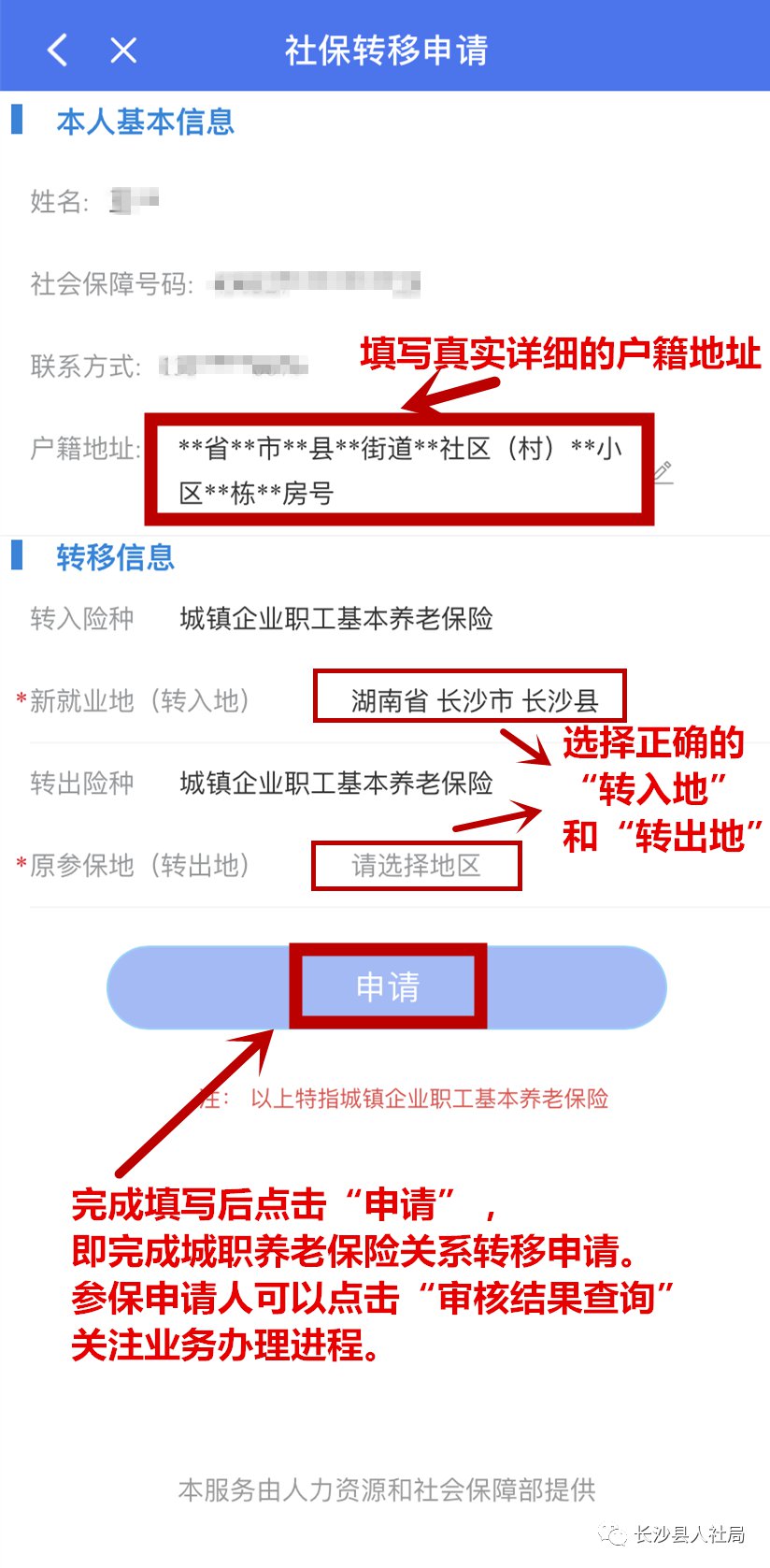 4.填写转移申请信息,点击“申请”即完成社保转移申请。