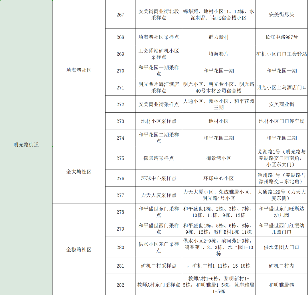 4月22日合肥瑶海区明光路街道核酸采样点分布表: