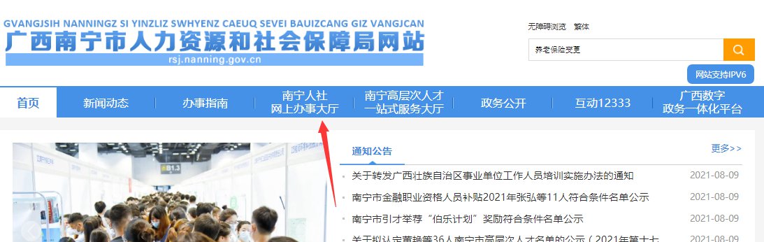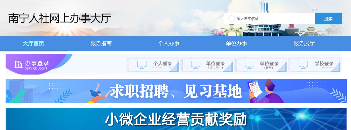 登录南宁市人力资源和社会保障局网站,点击“人社网上办事大厅”。