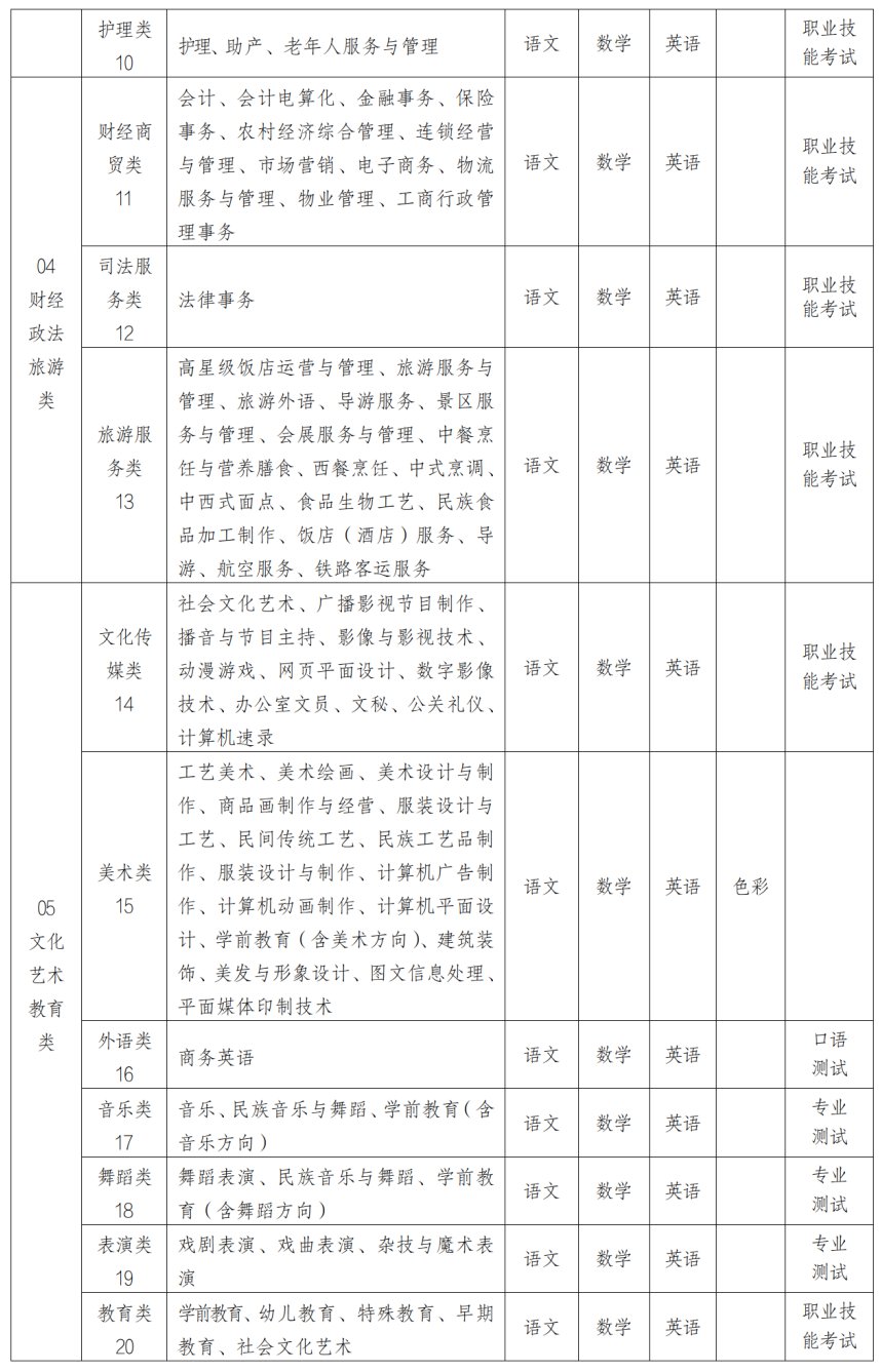 2022年对口升学考试继续试行“文化素质+职业技能”的考试办法。文化素质考试科目为语文、数学、英语3科。信息技术类、加工制造类、土木水利类、交通运输类、资源环境类、石油化工类、种植园艺类、养殖类、医学相关类、护理类、财经商贸类、司法服务类、旅游服务类、文化传媒类、教育类根据不同专业进行职业技能考试;外语类专业进行口语测试音乐类、舞蹈类、表演类、美术类专业进行专业测试