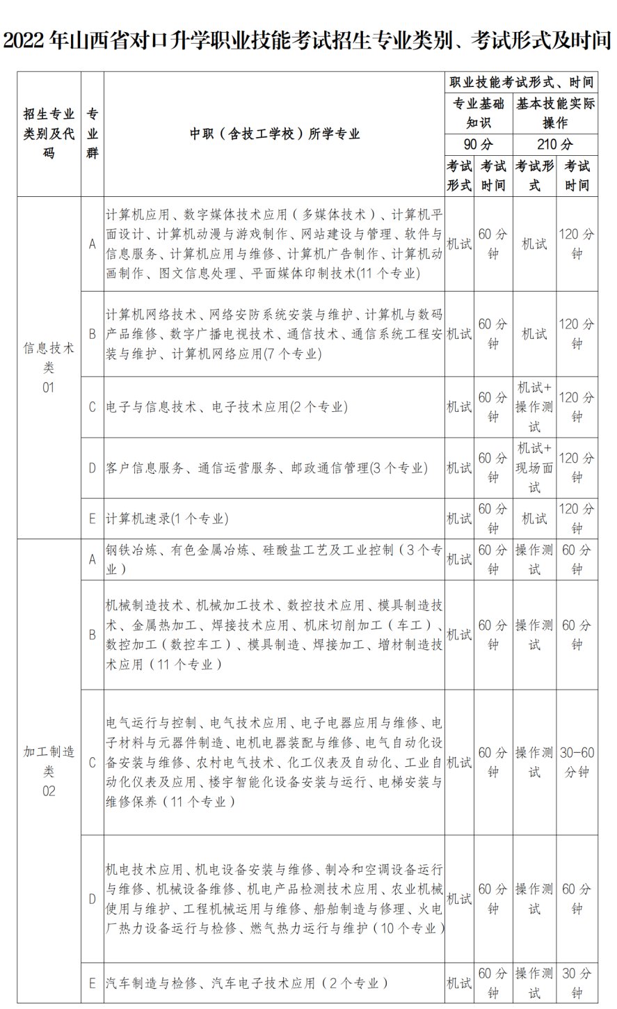 根据《山西省教育厅关于做好2022年中等职业学校毕业生对口升学工作的通知》(晋教职成〔2021〕15号)和《山西省招行考试管理中心关于做好2022年中等职业学校毕业生对口升学招生考试工作的通知》文件精神,2022年部分高等院校继续从中等职业学校(含普通中专学校、职业中专学校、职业高中学校、成人中专学校、技工学校,下同)毕业生中对口招生,现将招生考试工作的有关事项公告如下。