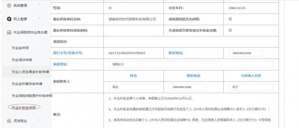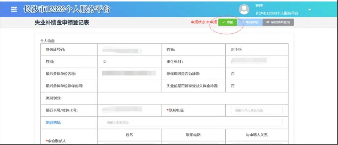 第四步:完成申报,有社保卡的系统将自动关联社保卡,无社保卡必须填报本人长沙银行卡,完善家庭住址、联系人、联系电话、与申请人关系,完成申报。