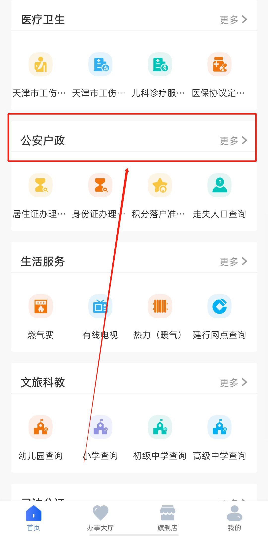 微信搜索“津心办官方”小程序并点击进入;或者点击并长按下方二维码识别进入小程序,进入后将页面下滑,在“公安户政”栏下点击“更多”,接着点击“身份证办理进度查询”即可。