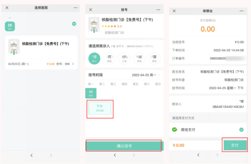 2.在打开的页面点击“核酸检测门诊”——选择就诊人——点击挂号时段“上午”或“下午”——点击“确认挂号”——在弹出的页面中点击“支付”(即挂号成功)。