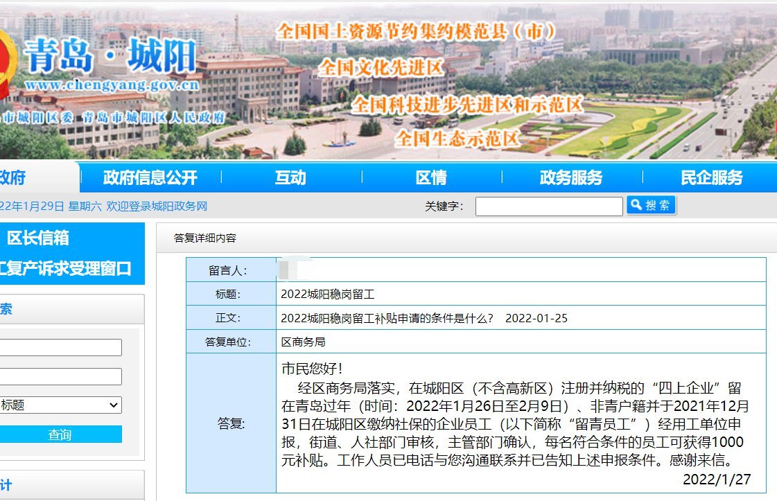城阳区商务局对此的答复是:经区商务局落实,在城阳区(不含高新区)注册并纳税的“四上企业”留在青岛过年(时间:2022年1月26日至2月9日)、非青户籍并于2021年12月31日在城阳区缴纳社保的企业员工(以下简称“留青员工”)经用工单位申报,街道、人社部门审核,主管部门确认,每名符合条件的员工可获得1000元补贴。