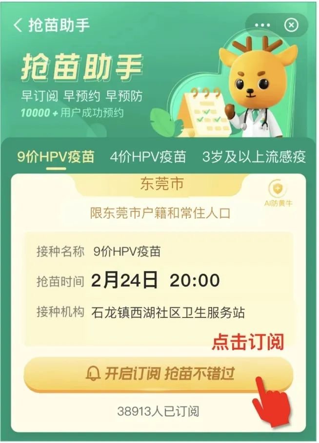 东莞市石龙镇西湖社区卫生服务站将于2月24日20:00 开放线上预约四价70支、国产二价20支、九价220支,仅限首针、仅限首针、仅限首针!!!
