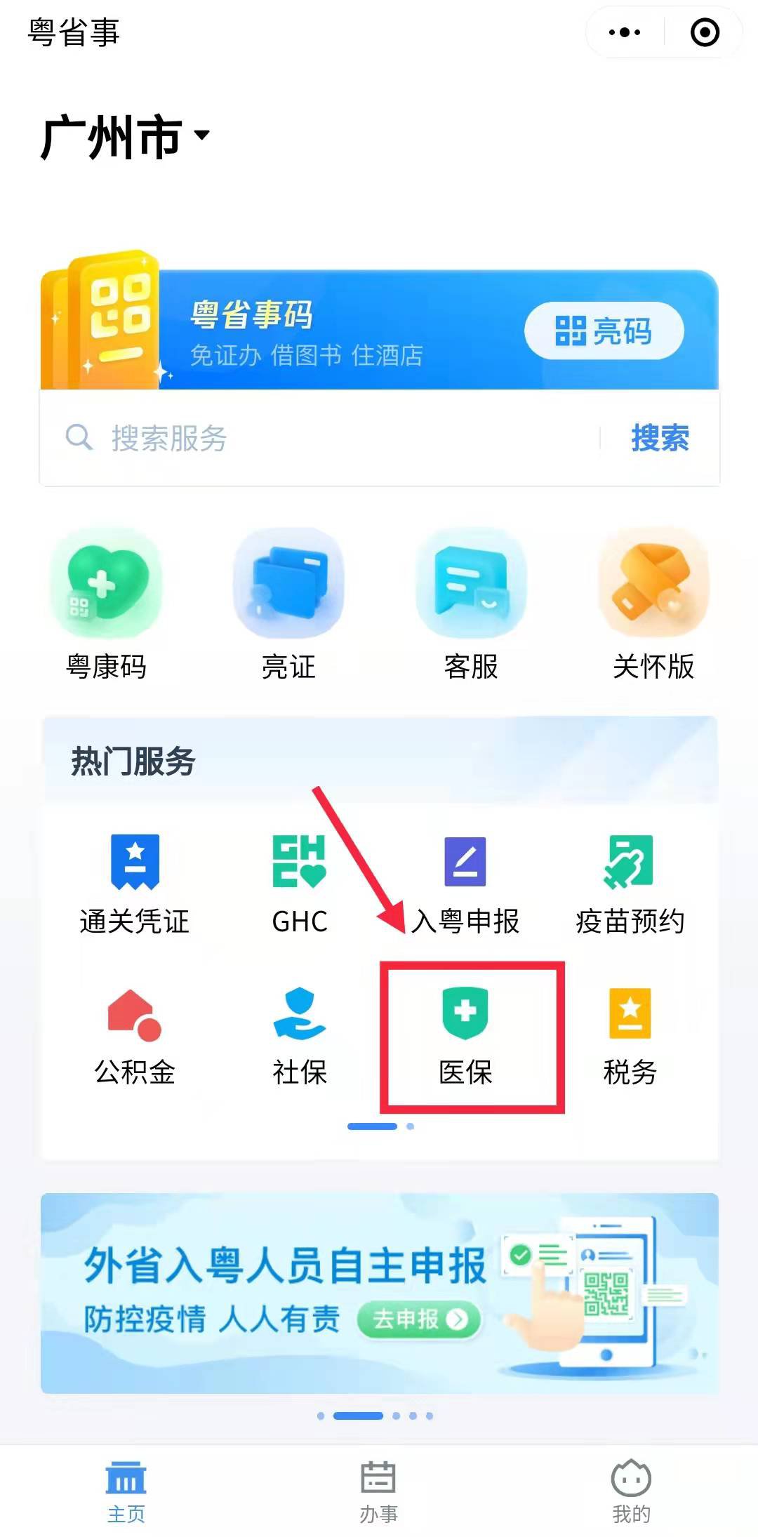 第一步:进入粤省事小程序,登录之后,找到【热门服务】--【医保】,如下图所示: