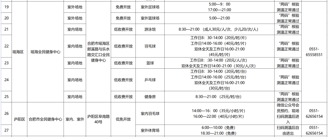为方便广大合肥市民就近就便参与健身,及时了解、掌握身边公共体育场馆信息,合肥市体育局将于本月起,每月动态发布全市公共体育场馆开放时间和相关收费标准。