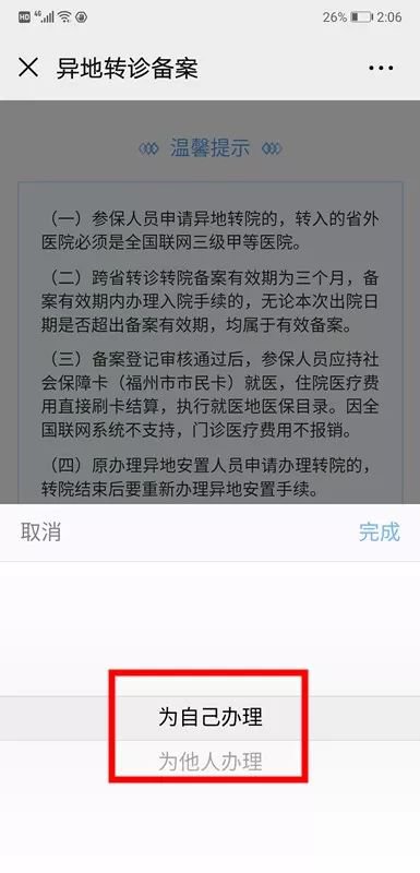 选择“为自己办理”或“为他人办理”,选择后点击“完成”。