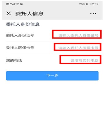 若为他人办理,需填充委托人(委托人也需为福州市参保人员)信息,包括委托人身份证号码、社会保障卡卡号、受委托人的电话号码。填完信息后,点击“下一步”