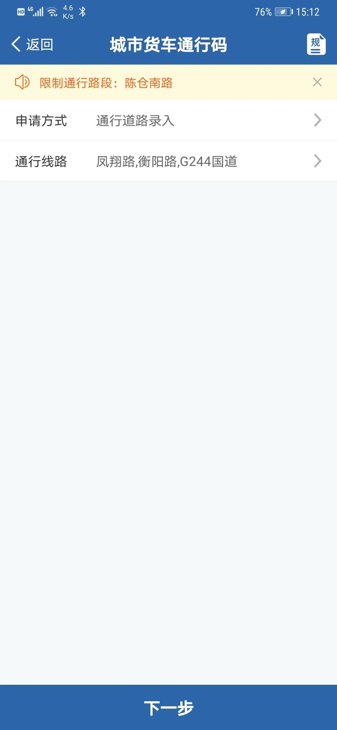 用户可通过三种方式选择通行线路(区域)。方式一:自行规划线路。申请方式选择“线路规划”,通过设置起点、途经点、终点后系统根据地图算法规划路线,用户选择其中一条线路作为通行线路。方式二:选择区域通行。申请方式选择“区域通行”,用户直接在通行区域列表中选择一个区域作为通行区域。方式三:录入通行道路。申请方式选择“通行道路录入”,用户通过手工录入需要通行的每条道路名称。点击“下一步”进入第四步。