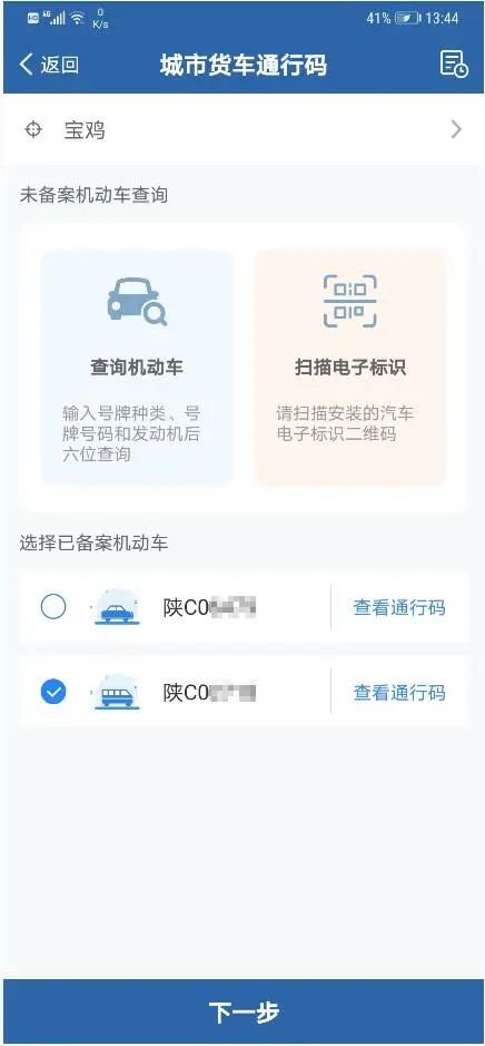 选择通行码申领城市(默认用户注册地)后,继续在已备案的机动车列表中选择申领通行码的机动车。点击“下一步”进入第二步。