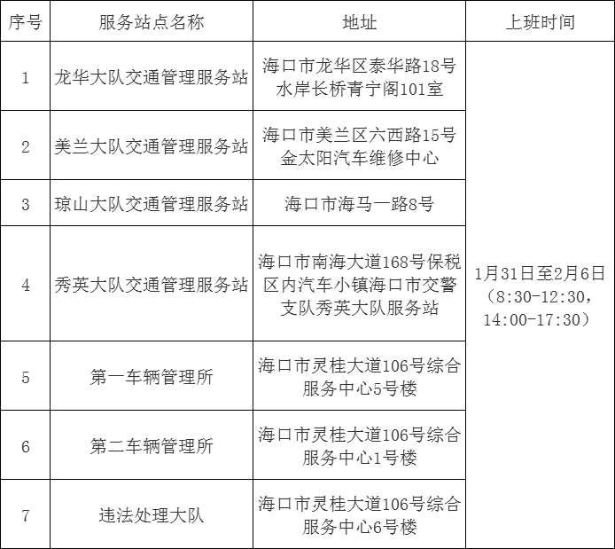 2022年1月31日至2月6日,海口公安交警交管业务服务站、快处快赔服务点共计11个站点正常办理业务,方便市民办理机动车、驾驶证、交通违法处理、交通事故快处快赔和新国标电动自行车带牌销售注册审核等业务。