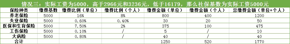 (三)第三种情况,假如你实际工资为5000元,高于2966元和3236元,低于16179元,那么社保缴费基数就按照实际工资5000元来计算: