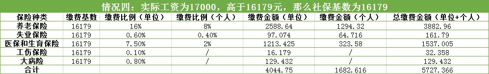 (四)第四种情况,假如你实际工资为17000元,高于16179元,那么社保缴费基数就按照16179元来计算: