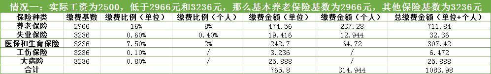 假如你实际工资为2500元,低于2966元和3236元,那么基本养老保险基数按照2966元来算,其他保险按照基数3236来算: