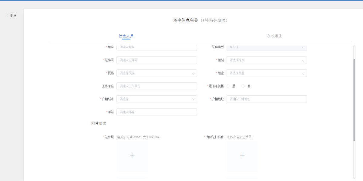 2.上传要求请注意:身份证正反面合并为同一页面上传,且要清晰可见。社会人士:东莞户籍需上传证件照、身份证(扫描件),非东莞户籍需上传证件照、身份证(扫描件)及在东莞工作或居住的证明(扫描件)。根据疫情防控需要,还需上传粤康码、行程码等材料。
