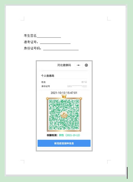 2.微信下载登录“河北健康码”,查询本人核酸检测信息并截图,A4纸打印后本人签名,标注准考证号、身份证号码。