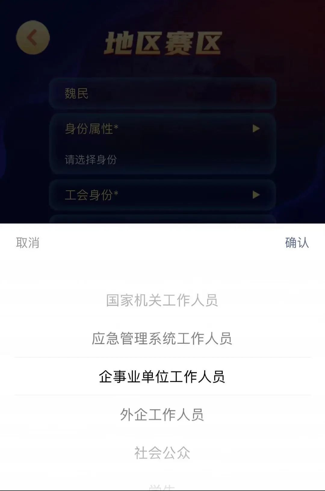 应急系统工作人员、国家机关工作人员、企事业单位工作人员、学生及其他社会公众,请选择【地区赛区】。