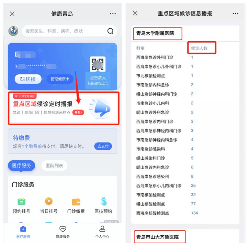 为方便群众就医,提高就医效率及质量,“健康青岛”微信公众号于1月24日晚上线急诊、发热门诊、核酸检测候诊信息定时播报功能,可随时查看部分大型医院科室候诊人数。