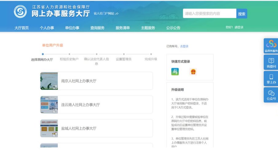 在省系统上线前已经在南京市系统注册的单位,可在登陆时选择老用户升级的方式进行网办注册,升级有困难的也可采用法人线上注册或线下柜面注册的方式完成注册。