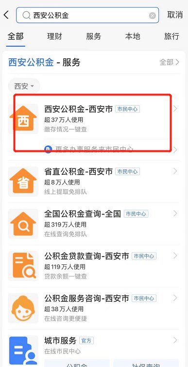 1、进入支付宝,搜索西安公积金