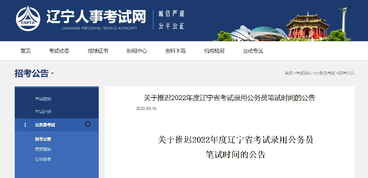 为贯彻落实辽宁省新冠肺炎疫情防控部署要求,保障广大考生和考试工作人员身体健康和生命安全,经研究,决定推迟原定于2022年3月26日至27日组织的2022年度辽宁省考试录用公务员笔试,重启时间和打印准考证时间将根据疫情防控情况另行通知。请广大考生密切关注辽宁人事考试网(www.lnrsks.com)发布的相关信息,了解最新考试安排,并按照《2022年度辽宁省考试录用公务员笔试新冠肺炎疫情防控告知书》做好健康管理和个人防护。