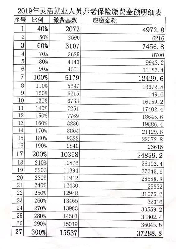 自2019年1月1日起个体工商户和灵活就业人员参加企业职工基本养老保险,按照调整计算口径后的全省城镇单位就业人员月人均工资5179元,核定个人缴费基数上下限,按全口径城镇单位就业人员月人均工资每档增加10个百份点确定灵活就业人员缴费档次(40%—300%共27个缴费档次),供个体工商户和灵活就业人员根据自身情况选择缴费档次。