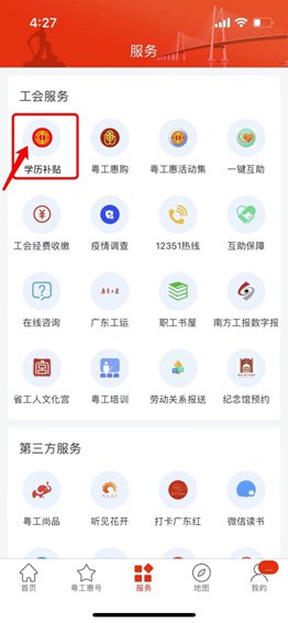 (1)登录粤工惠App,进入「服务」-「工会服务」点击「学历补贴」。