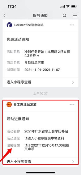 1.系统初审通过后,将按照申领人预报名序号顺序,通过微信服务通知(需授权)及手机短信向验证通过的申领人推送“提交申领材料”通知,申领人从服务通知入口进入“学历补贴”服务。(或直接搜索「粤工惠津贴发放」小程序进入)