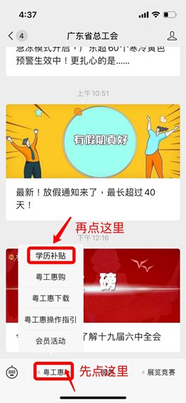 (2)关注「广东省总工会」微信公众号,从主页菜单「粤工惠」点击「学历补贴」。