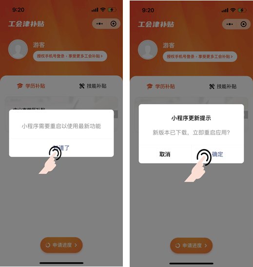 使用本人实名认证的微信号,进入「粤工惠津贴发放」小程序,按照页面提示完成小程序更新。
