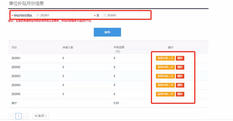 3、若补贴申请条件选择:“受疫情影响出现生产经营暂时困难导致停工停业的中小微企业(企业当月增值税指标比2019年同期下降70%及以上),组织职工开展以工代训”、“受疫情影响较大的外贸、住宿餐饮、文化旅游、交通运输、批发零售五个行业的大型企业,组织职工开展以工代训的”,单位信息保存后,选择单位补贴月份范围;