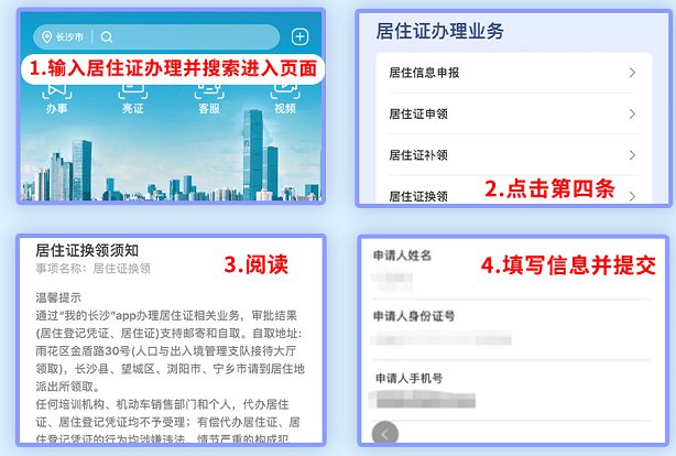 进入我的长沙页面,选择居住证办理页面-选择【居住证换领】-阅读【防范电信网络诈骗】信息-浏览并同意【居住证换领须知】-进行【实人认证】-填写相关信息-提交相关材料-提交申请-等待审核结果;