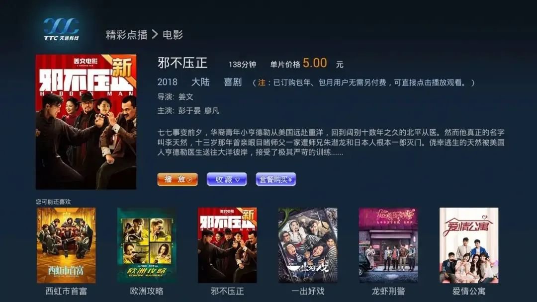 通过遥控器点击“播放”,即可手机扫码单片支付。
