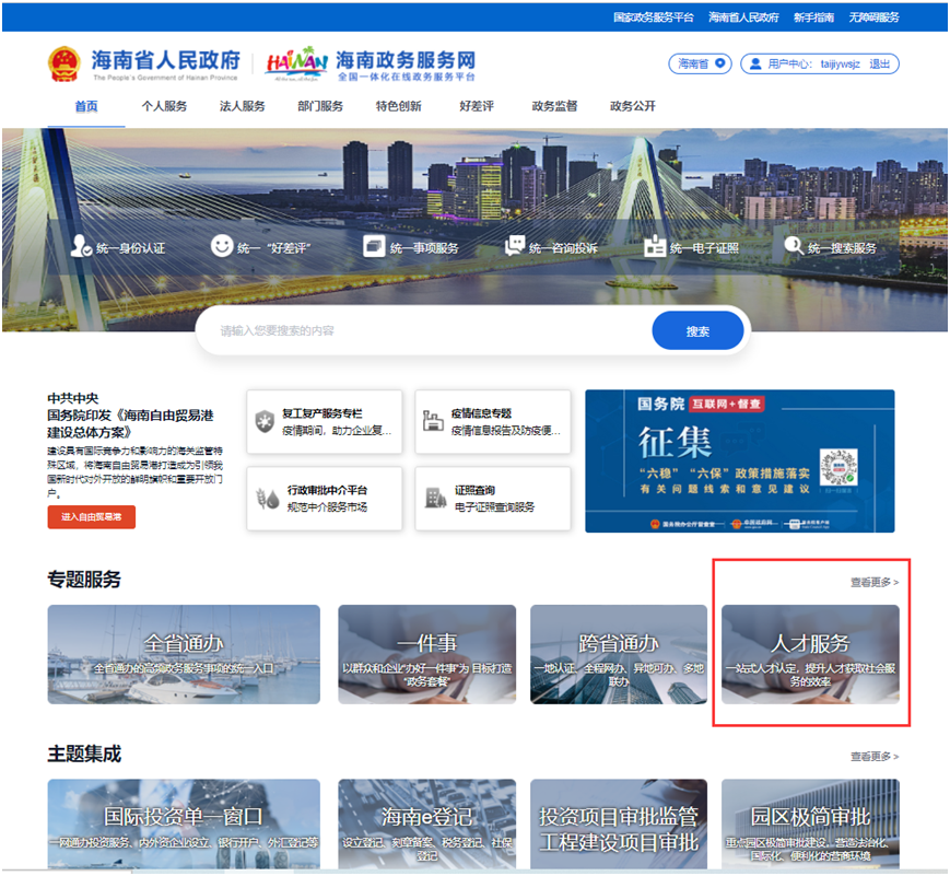 步骤3:进入人才事项服务:点击“首页”,点击“人才服务”图标。进入人才事项服务页面。