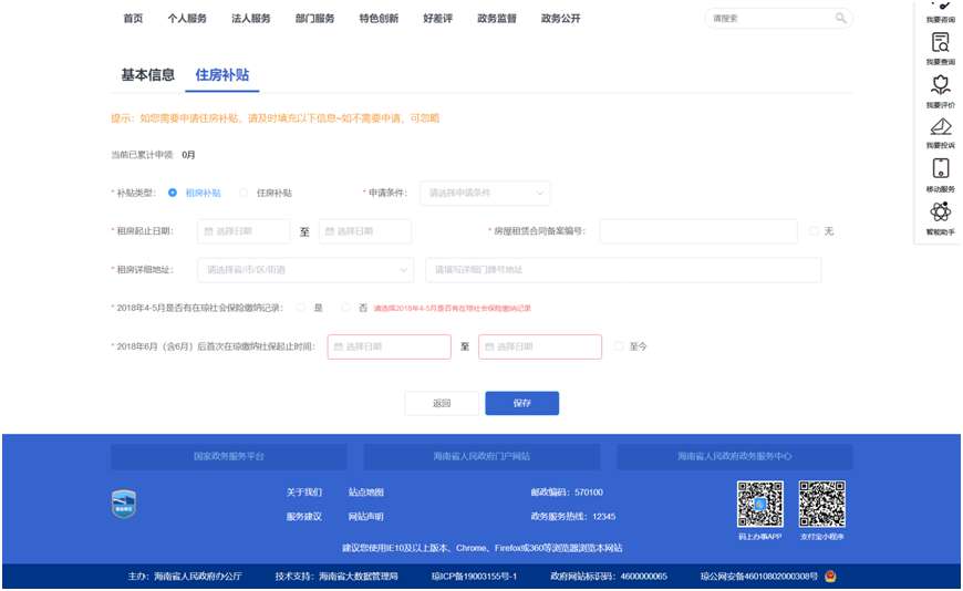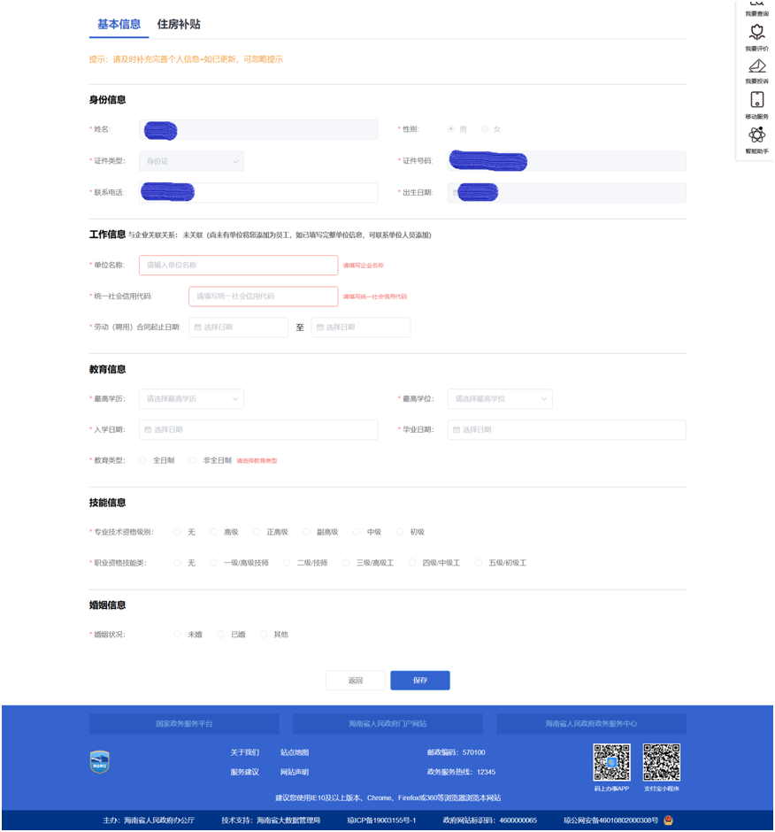 步骤2:在人才专属空间维护“基本信息”和“住房补贴”信息,填写完成后点击“保存”进行存档,需补全信息如下图:
