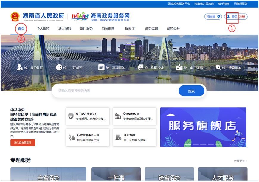 步骤2:点击右上角登录按钮,输入账号和密码登录政务服务网。无账号的可以先注册。