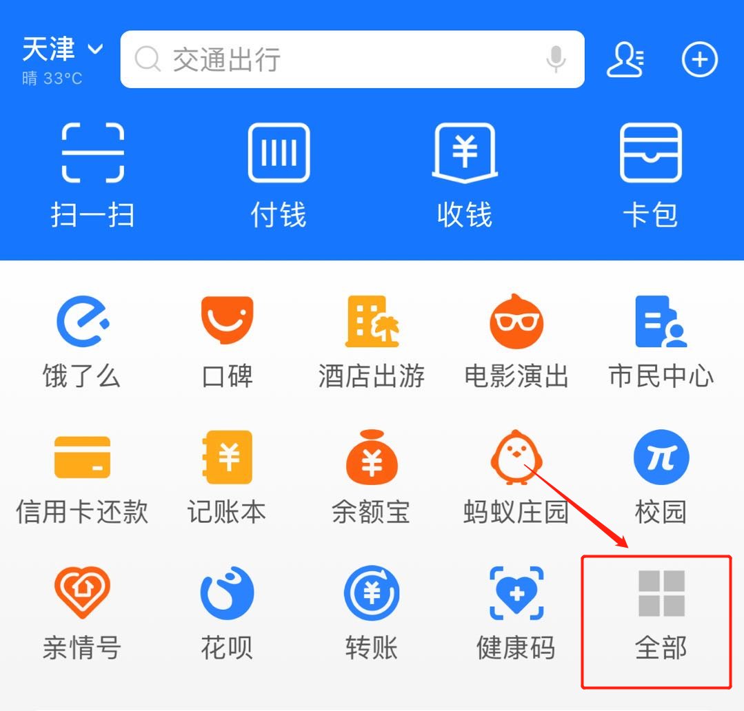 第一步,登录本人实名认证的支付宝客户端,点击“全部”