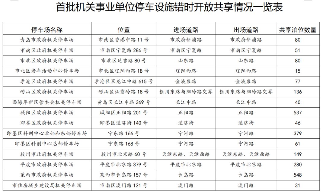 首批开放共享青岛市、区(市)政府机关专用停车场及集中办公场所停车场,共计15个停车场,共享泊位约2500个。
